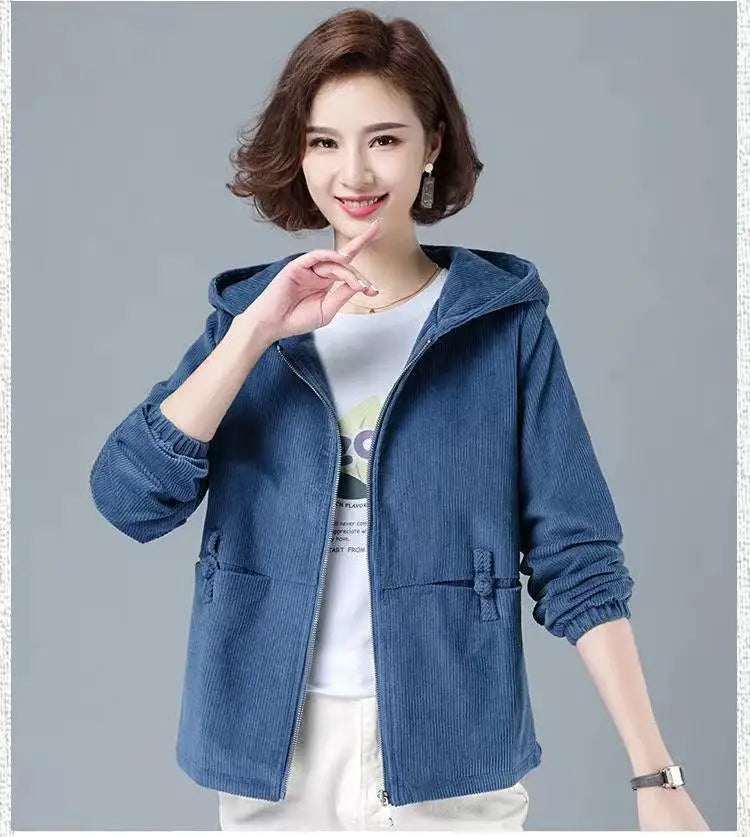 A must-have for your fall and winter wardrobe, the Women's Corduroy Hooded Jacket will keep you warm and stylish. Combining texture and comfort, this jacket is made from soft, durable corduroy fabric , providing warmth without compromising on style. The attached hood offers extra protection from the elements, while the front zip closure allows for versatile styling. With a relaxed fit and convenient side pockets, this jacket is perfect for layering over casual outfits or pairing with dresses for a chic, laid-back look.