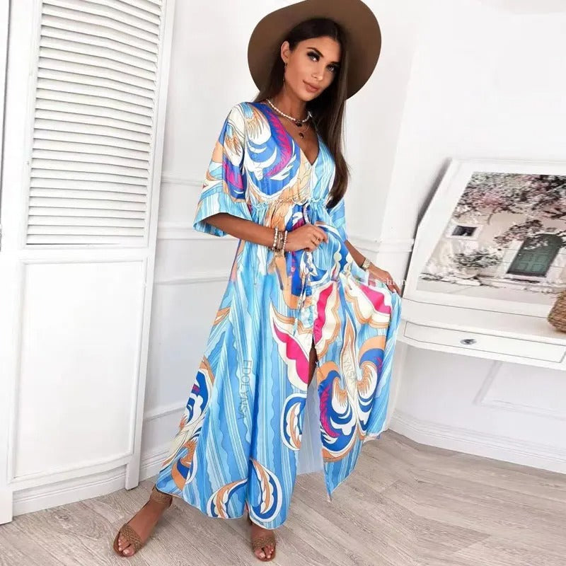 Boostez votre tenue d'été avec Audrey ! Avec son magnifique col en V profond, sa fente haute et ses manches longues, cette belle robe longue imprimée est idéale pour faire tourner les têtes. L'ambiance bohème le maintient actuel, et la silhouette ajustable et la taille naturelle le rendent attrayant et flatteur . Illuminez votre look avec cette beauté chic et impertinente !